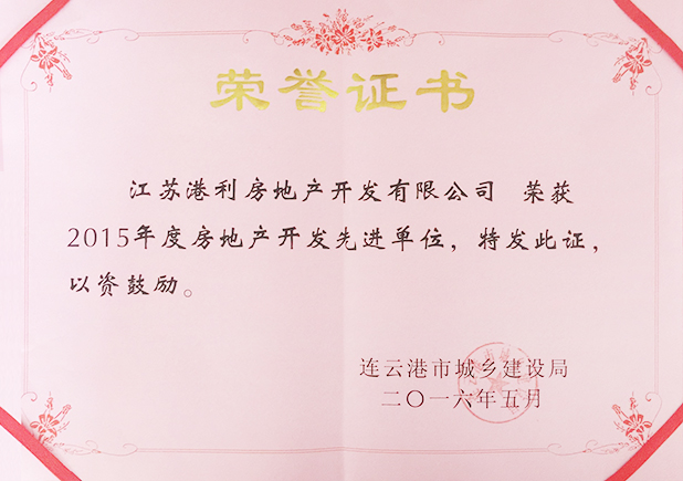 日前,經連雲港市住房和城鄉建設局評審,集團下屬江蘇港利房地產開發有限公司、連雲港港利房產開發有限公司被授予“2015年度市房地產開發先進單位”榮譽稱號,同時,連雲港港利房產開發有限公司董事長、總經理王繼明及其財務科科長胡小雲同誌被評為連雲港市“2015年度房地產開發先進個人”。