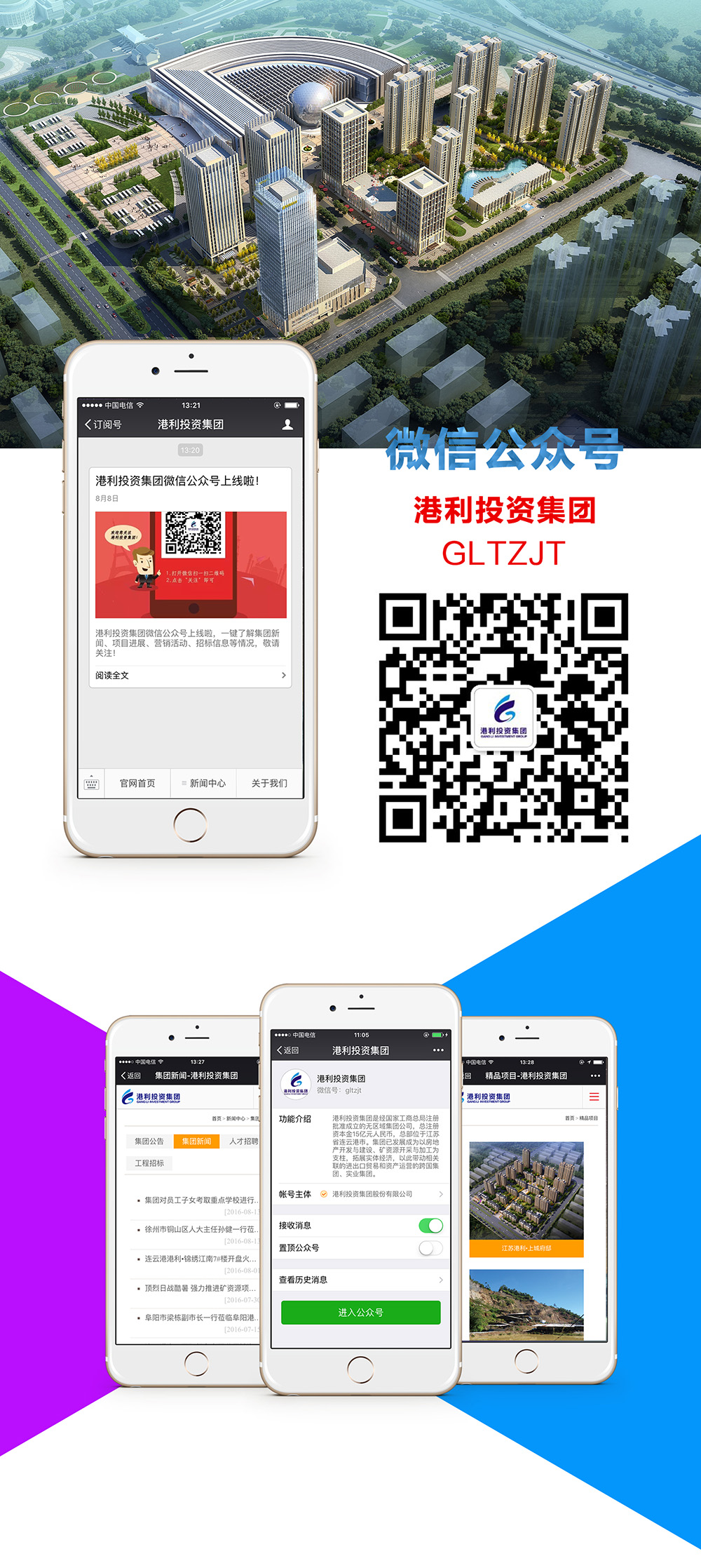 此次網站改版升級,對原有頁麵和欄目內容進行重新設計和優化,新版首頁更加簡潔、條理清晰,並沿襲了集團標誌的藍色主色調和寬頻版式,圖片全部采用16:9的寬幅樣式,提升閱讀體驗。而網站WAP版(ban)本(ben)和(he)微(wei)信(xin)公(gong)眾(zhong)號(hao)的(de)誕(dan)生(sheng),將(jiang)集(ji)團(tuan)網(wang)站(zhan)從(cong)桌(zhuo)上(shang)搬(ban)到(dao)掌(zhang)上(shang),從(cong)有(you)線(xian)向(xiang)無(wu)線(xian)延(yan)伸(shen),方(fang)便(bian)公(gong)眾(zhong)通(tong)過(guo)手(shou)機(ji)等(deng)移(yi)動(dong)終(zhong)端(duan)及(ji)時(shi)獲(huo)取(qu)相(xiang)關(guan)信(xin)息(xi)。即(ji)日(ri)起(qi),隻(zhi)要(yao)在(zai)“微信”軟件中點擊“添加朋友”搜索“GLTZJT”,或在“掃一掃”下方的二維碼,關注港利投資集團公眾號,即可隨時獲得集團的最新動態資訊。