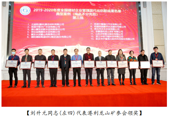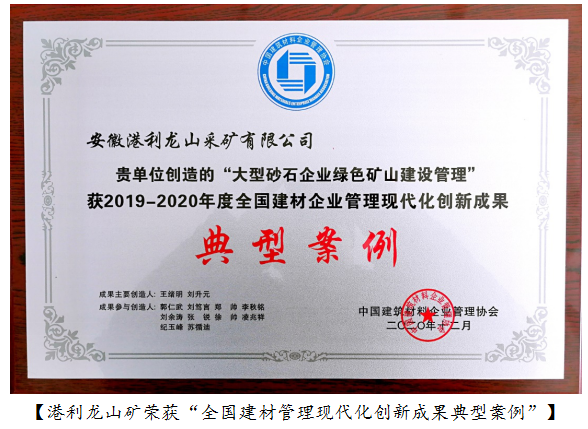 由於疫情原因,大會延期到年末才得以舉行,經過全國各省、市、自治區建材協會、大型建材集團等相關單位2019、2020兩個年度的初審、終審,最終確定港利龍山礦申報的《大型砂石企業綠色礦山建設管理》入選“2020年全國建材企業管理現代化創新成果”獎,並決定授予港利龍山礦董事長、總經理王緒明同誌“2020年全國建材企業管理創新突出貢獻人物”榮譽稱號。