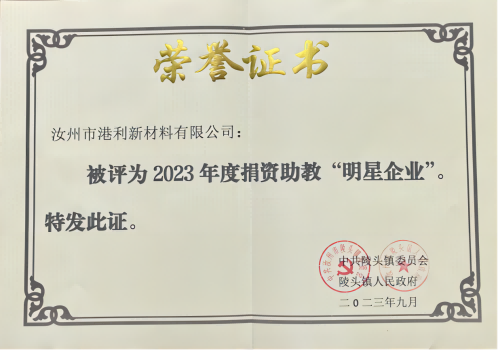 2023年9月8日,集團汝州市港利新材料有限公司榮獲河南省汝州市陵頭鎮2023年度捐資助教“明星企業”榮譽牌匾和榮譽證書,陵頭鎮黨委副書記、鎮長宋曉宇,副鎮長姚延昭,副鎮長夏瀅潔和中心校黨總支書記、校長甄鐵希等領導專程前來授牌並慰問公司的幹部員工,感謝集團為陵頭鎮教育事業做出的貢獻。
