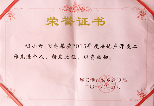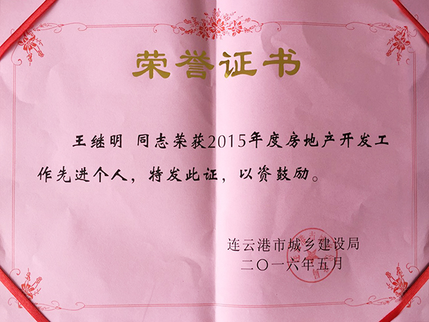 日前,經連雲港市住房和城鄉建設局評審,集團下屬江蘇港利房地產開發有限公司、連雲港港利房產開發有限公司被授予“2015年度市房地產開發先進單位”榮譽稱號,同時,連雲港港利房產開發有限公司董事長、總經理王繼明及其財務科科長胡小雲同誌被評為連雲港市“2015年度房地產開發先進個人”。