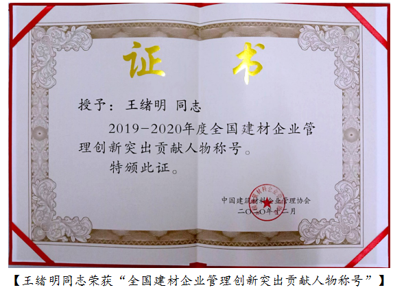 由於疫情原因,大會延期到年末才得以舉行,經過全國各省、市、自治區建材協會、大型建材集團等相關單位2019、2020兩個年度的初審、終審,最終確定港利龍山礦申報的《大型砂石企業綠色礦山建設管理》入選“2020年全國建材企業管理現代化創新成果”獎,並決定授予港利龍山礦董事長、總經理王緒明同誌“2020年全國建材企業管理創新突出貢獻人物”榮譽稱號。