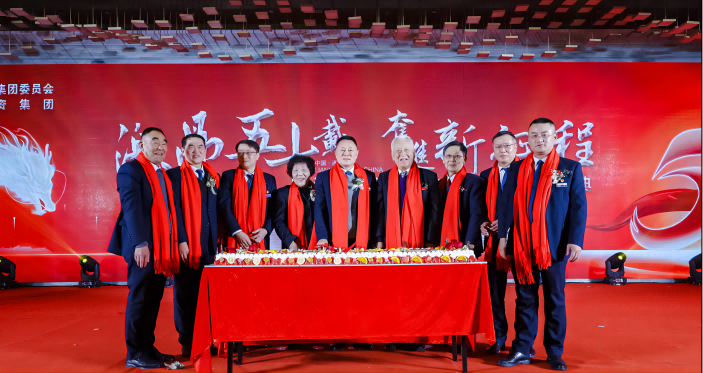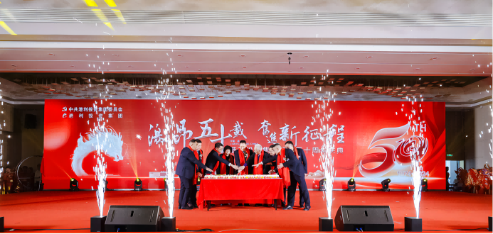 致辭結束後,彭董事長與到場的離退休老領導、黨委領導班子登台,共同切下象征發展、新生的蛋糕,並一同用手掌開啟50周年慶典啟動儀式,為集團50周年華誕慶生祝賀!