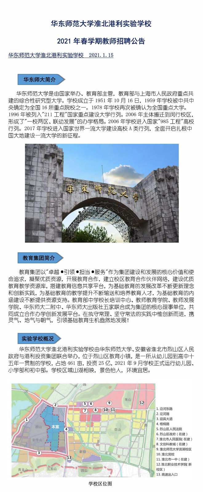 華東師範大學淮北港利實驗學校2021年春學期教師招聘公告